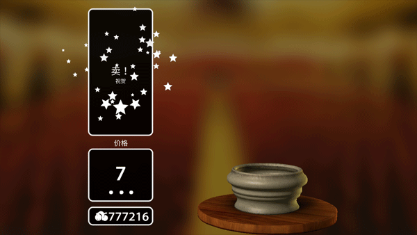 在成品界面点击右下角的拍卖图标,可以将作品拍卖。最开始的作品由于造型和装饰等都很简单,只能卖到几十元,而随着陶器的造型及上色等越来越复杂,价格也会飙升。看着自己辛苦制作的陶器卖出一个好价钱,既高兴又有些不舍。卖出陶器后,我们可以去商店购买颜料、装饰等,用来制作更加漂亮的陶器。