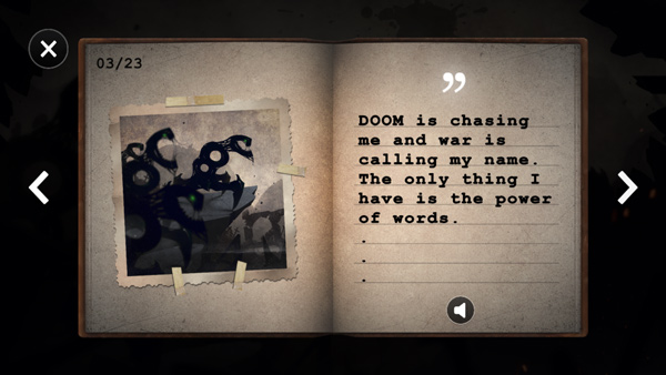 1、黑暗艺术风格,结合适当的背景音效和幽默的迷题,谜题简单易懂,你所要做的就是使用字母组合来打败怪物和克服障碍;
