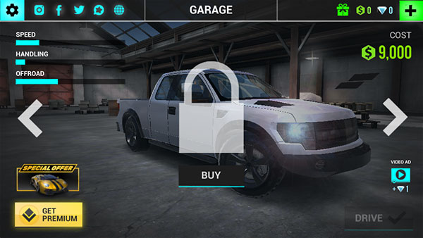 1、首先进入游戏可以通过左右滑动来更换汽车,一辆好汽车是比赛获胜的关键