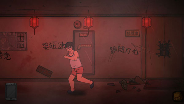 2、按下开关,?位置,灯光开始闪烁,人物需要紧紧跟随亮光来进行跑动【墙上的字是提示】,直到跑到出口,我跑了五六次,有规律的。该场景结束。
