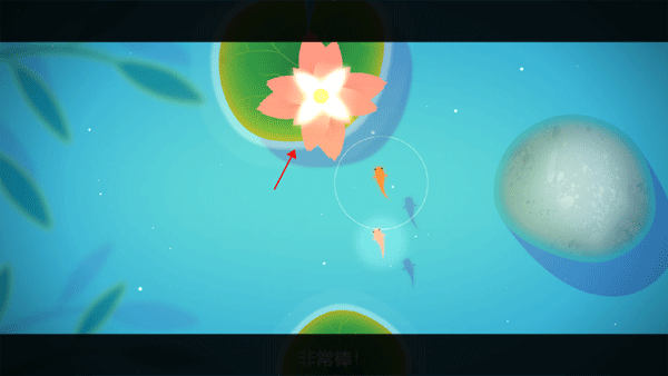 5、将黄色小鱼带到黄色的荷花附近,按下出现在荷叶上方的按钮就可以让黄花开花了。
