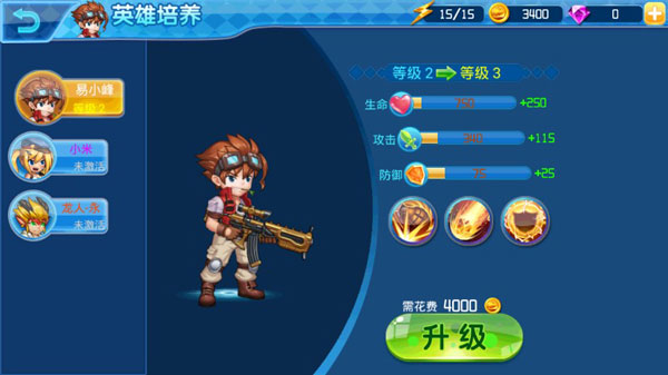 这款游戏共包含了三种人物,其分别为易小峰、小米和龙人,三款不同的人物所拥有的战斗力和技能也都存在着一定的差异,但玩家可以通过对其中的人物进行升级强化,来提升他们各自的战斗力。