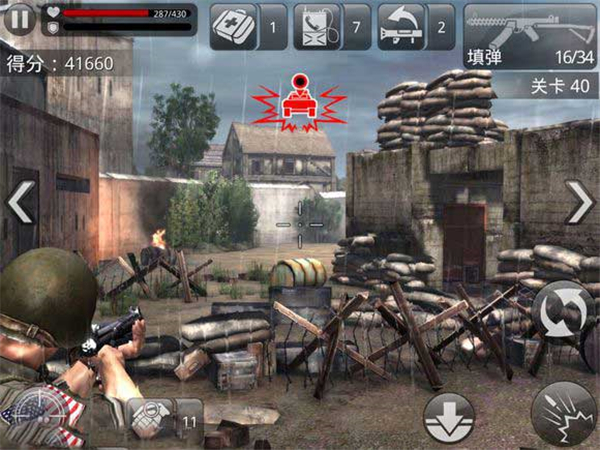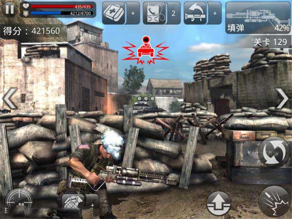 四、用超司配合雷打到40关,获得火枪。(过了第30关后,超司明显的吃力,需要用雷做主力,最方便用雷的场景是“大门”,姜兄称为地堡。在敌兵将要出来的时候,往门口扔一个雷可以解决6个敌兵,超司对付左边的一个敌兵还是可以的。进入关卡的场景是随机的,可以多试几次,如果一直是一个场景,不妨杀两个敌兵再退出再进,就会换场景,直到大门场景),升级装甲满血(可能A不够升满装甲,留最后“减少10%伤害”可以不升,但加血的环节一定要升——关系到帽子的血量)