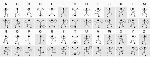 运用舞动的小人密码(这种密码出自于《福尔摩斯探案集》。每一一个跳舞的小人实际上对应的是英文二十六个字母中的一个,而小人手中的旗子则表明该字母是单词的最后一个字母,如果仅仅是一个单词而不是句子,或者是句子中最后的一个单词,则单词中最后一个字母不必举旗。)即可得出答案的七个字母为:fanghuo