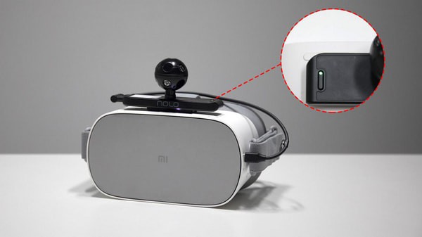 将头盔定位器插入定位器卡座固定好后,开启小米VR一体机,使用Micro接口的OTG短线先连接小米VR一体机,再连接头盔定位器,否则若小米VR一体机电量低于50%时可能出现连接失败,头盔定位器上指示灯呈绿色表示连接成功;
