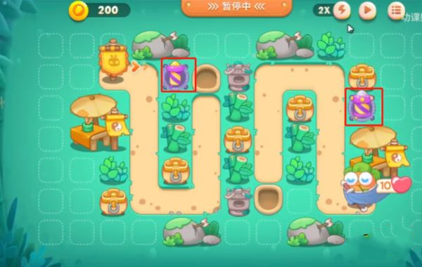 1、在起点右边和最右边的位置去建造炮塔,起点的用来攻击怪物,最右边的用来清理障碍。如图所示。