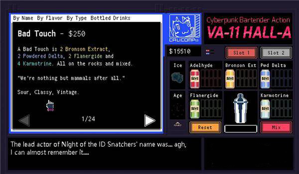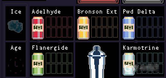 调配框:屏幕右侧为调配框,当中会显示五种调酒材料(adaelhyde、bronson ext、pwd delta、flanergide.karmotrine) 、两种添加物(冰块、age) 、两个槽(1槽、2槽)以及两个操作键(重置和混合)。特别注意操作键"混合",初期混合是属于轻度摇晃,当5秒钟过后则会变成快速摇晃,某些饮品属于轻度摇晃的,则不能快速摇晃。
