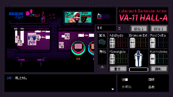 赛博朋克酒保行动英文名称为“va11halla”,是一款移植自steam超人气文字冒险游戏,游戏画风精美,融合了二次元漫画和复古风格的元素,给人一种奇特而独特的感觉,而玩家可以在游戏中的点唱机中选择任一首属于自己的十二首歌曲来播放,每一首都别具一格,让人回味无穷。