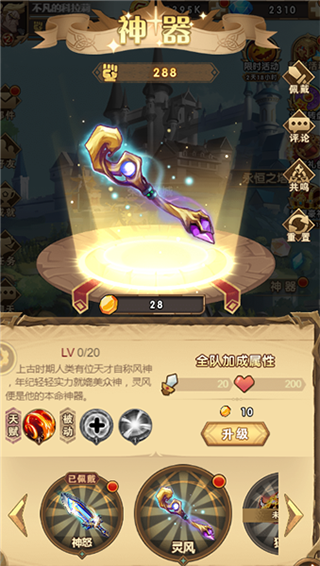 神器是主角手里的强大武器,能够驱散笼罩世界的黑暗,同时,神器也是游戏战斗力的重要战斗系统,强大的神器能够为阵容添加强大的火力。