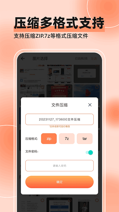 【文件压缩】支持图片、视频、音频、文档、安装包(apk)格式的压缩,生成zip,7z,tar等格式的压缩包;