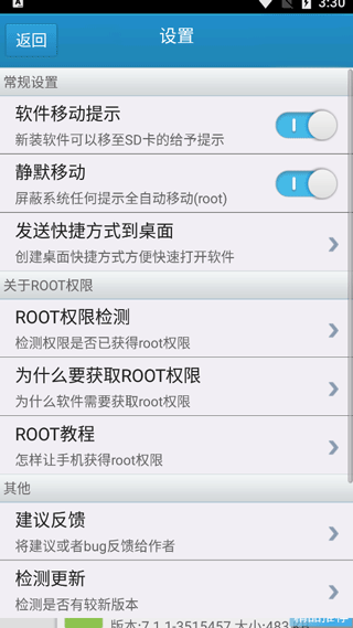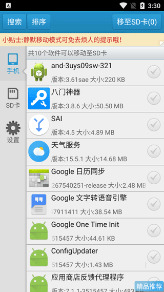软件一键移动到sd卡能够完美运行在android2.2-4.4平台上,它能够一键将手机内存中的软件移动到sd卡上,而且是无缝移动。经过我们数百上千次的测试,这完全不影响软件的使用和数据的完整性,真正做到了完美移动,有了它就可以释放更多的手机内存,让手机变得更流畅,让运行更加迅速,让性能变得更强。