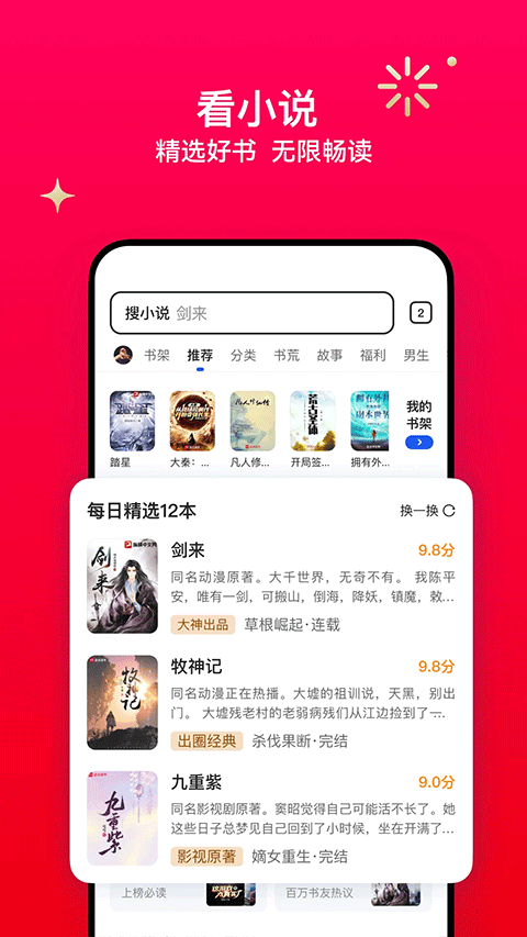 海量正版免费网文小说、影视原著、出版书籍每日更新,玄幻修仙、都市爽文、悬疑推理…个性化推荐你喜欢的优质好书;看书累了?还有听书服务;书荒怎么办?百万书友集结互助,话题书单享不停。坚持签到、阅读,还有腾讯游戏礼包、视频VIP会员福利