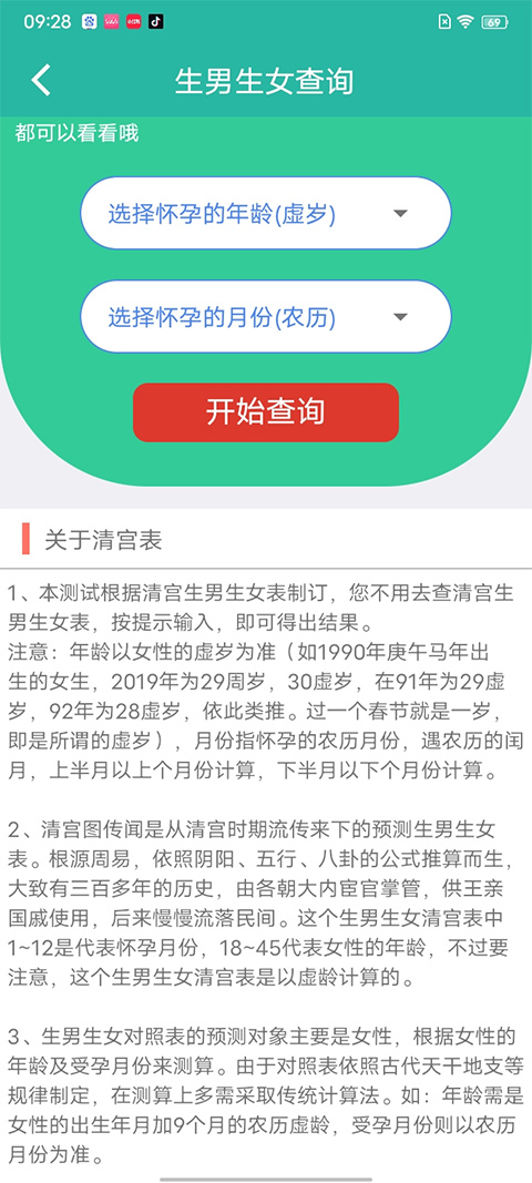 2、点击清宫表生男生女,输入怀孕年龄和怀孕月份,点击开始查询即可开始从表中调取相关信息。