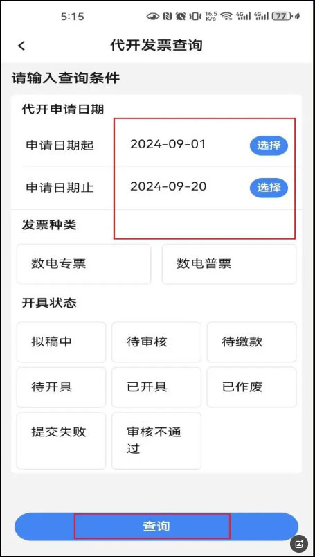 1、点击【办&查】-【发票使用】-【代开增值税发票】-【代开发票查询】查询待开具发票。