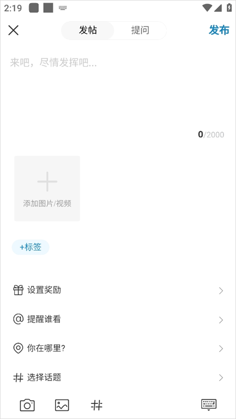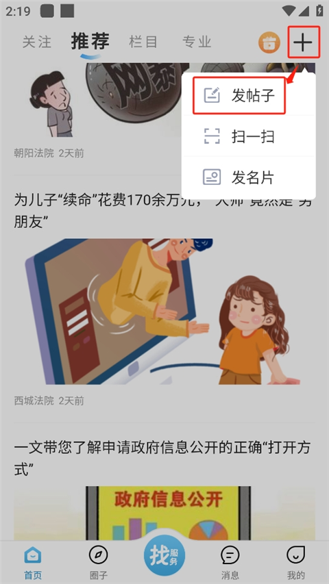 1、在软件首页选择右上角的“+”,下拉菜单中选择“发帖子”。
