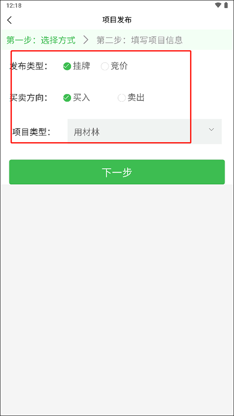 3、第一步就是选择方式,里面有发布类型、买卖方向以及项目类型。