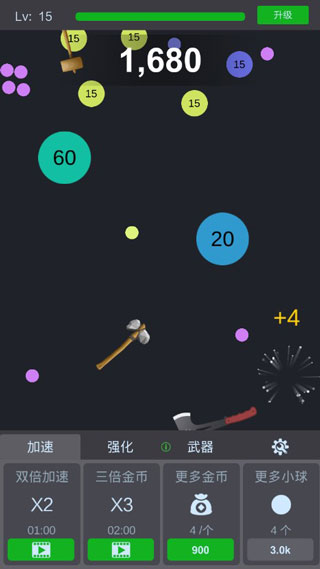 对于这款非常轻松休闲的放置挂机游戏,总体来说游戏并没有什么难度,只需要几分钟熟悉即可轻松掌握,在这里主要分为三大内容:加速、强化和武器。