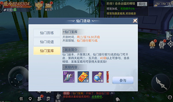 加入仙门者在活动开启后可进入该仙门的宝库。