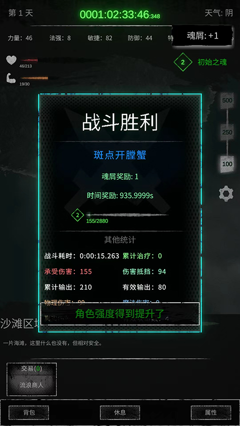 6、战斗胜利后可获得魂屑、时间和经验奖励,以及查看对战详情,