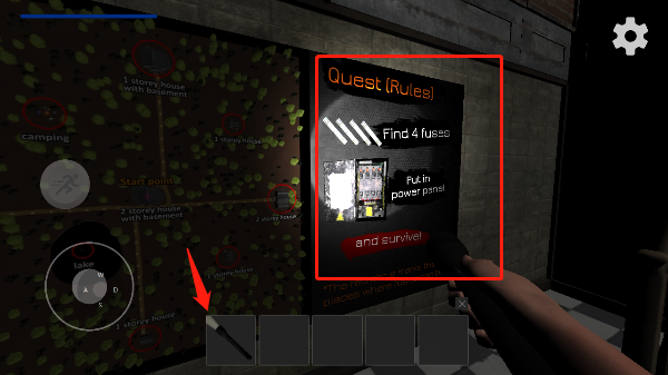 4、然后你就正式进入单人游戏啦,不要害怕哦,点击底下的工具,即可开关手电筒,在墙上你能看到关于这个游戏的任务规则,找到4个保险丝,普京电源板,最后结束生存!”这是一个令人振奋的猴子故事情节“。滑动屏幕可查看到不同的视角,这个房子里有许多楼层,每个楼层里都有数个房间,玩家可一一查看,直至完成任务。