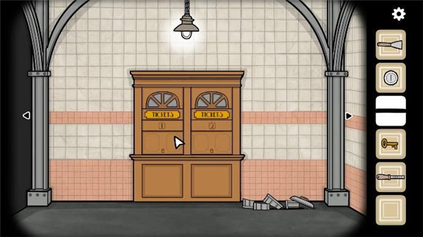 11、然后我们去到垃圾桶旁边的售票处,用钥匙开门,用水管敲击门框,叫醒售票员然后和她互动,提示我们需要一枚硬币。
