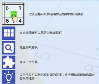 做题时一个好的方法就是从小九宫格入手,更好的方法是研究一组小九宫格,寻找出成对的数字,由此你可推出第三个。举个例子:如果左上角的小九宫格中有数字7,左下角的小九宫格中也有7,则不难推出左中的小九宫格中7的位置。同样也以用这样的方法解出水平位置的数字。如果存在两种可能性。记录下来,然后继续。每道题都可根据所提供的数字为线索,通过逻辑推理解答来。如果按照正确的解题方法,猜测就没有必要。先从已知数最多的横或竖或小方格做起,看这里可以填的是哪几个数,再一个一个地试(对比它的横或竖或小方格)。找到突破口是关键。这样可以解决初级的数独题。