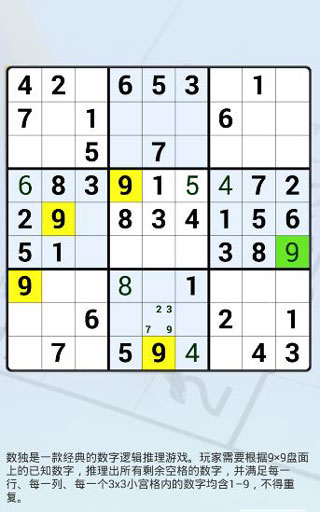 作为非常考验玩家推演和动手能力的游戏,数独世界中玩家须利用逻辑和推理以数字填进每一格,使每行、每列和每个宫(即3x3的大格)有1至9所有数字,不能重复,每个谜题只有一个答案。一个已解答的数独其实是一种多宫限制的拉丁方阵,因为同一个数字不可能在同一行、列或宫中出现多于一次。