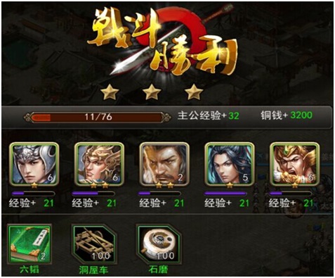 攻城战斗胜利后可获得丰厚的奖励,比如主公和武将的经验值,铜钱,道具等,是提高士气,激发战斗欲望与升级的不二选择。