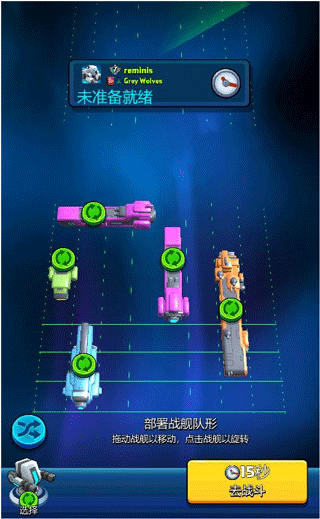 2、点击开始游戏,匹配到人后可以看到入下图的准备界面,可以通过手动或者自动调整战舰阵容,这里建议最好手动调整,战舰的站位不要太密集,如果太密集容易被对手一波炸完