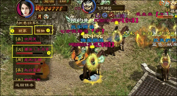 在PK或者打boss的时候,如果你先实现精准打击,就要留意右边的任务栏位置。先切换到“附近”再根据你是打boss还是PK选择“玩家”栏或者“怪物栏”。精准打击在国战的时候,非常实用,挑残血的秒。击杀和助攻的奖励差别还是非常大的。