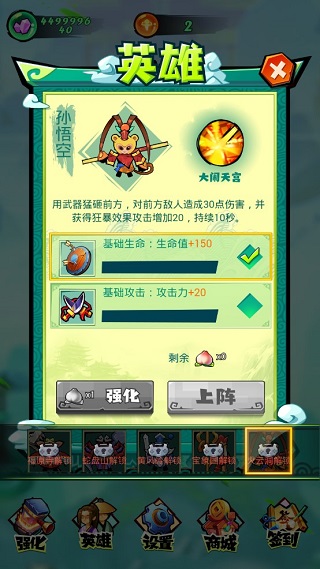 孙悟空,猪八戒,沙和尚,白龙马,唐僧,每个英雄都有各自的定位。灵活的根据关卡挑选合适的英雄可以更加轻松取胜。