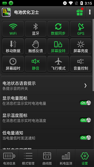 以曲线图形式记录最近三天的电池电量变化、温度变化以及电压变化走势。你还可以通过这些资料找出最适合自己的省电模式。