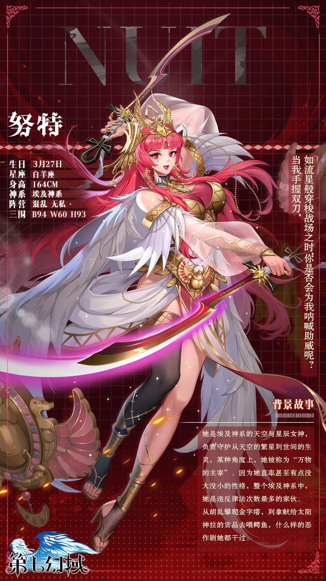 埃及神系的天空与星辰女神,负责守护从天空的繁星到世间的生灵,某种角度上,她被称为“万物的主宰”。此外,她也是著名的埃及九柱神之一,并担任了部分掌控死亡的神职,埃及很多石棺上都绘有她的形象,以祈求她的庇护。