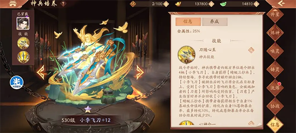 对一列目标造成伤害同时有几率减怒敌方,此次攻击额外附加暴击率和暴击强度,就算是0星技能也十分强悍,主角的暴击率不会低,加上技能上的暴击率与暴击强度可以打出不低的伤害,武将配合:吕布、贾诩、孙坚、赵云、张飞、夏侯惇、典韦、孙策等,在同一列中打出一列的伤害,更好的将对方减员,也可作为控制控制一列目标。