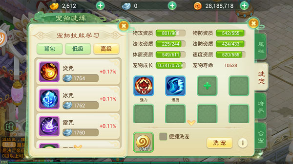体质资质:影响宠物的气血上限,体质资质越高,宠物的气血就越高。