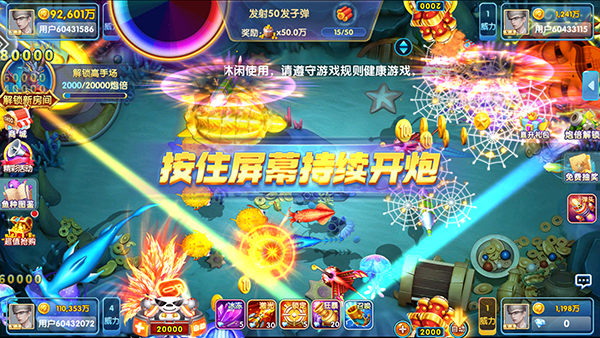 4、自由选择模式:玩家可以根据自己的喜好选择不同的捕鱼模式,包括但不限于初级模式、中级模式、高级模式等,每种模式都有不同的挑战和奖励。