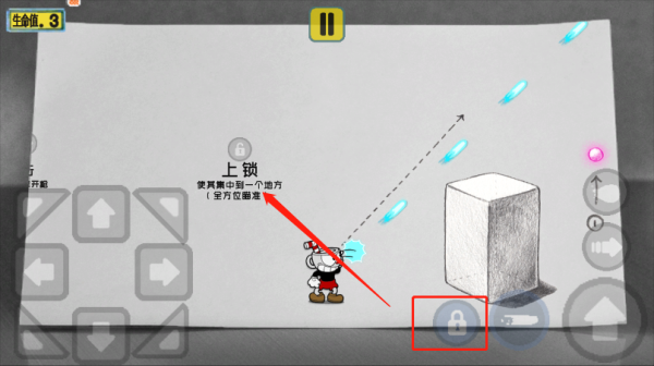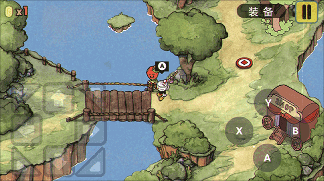 1、打开茶杯头大冒险完整版,进入游戏界面,按住图示向下的按钮可以进行躲避,