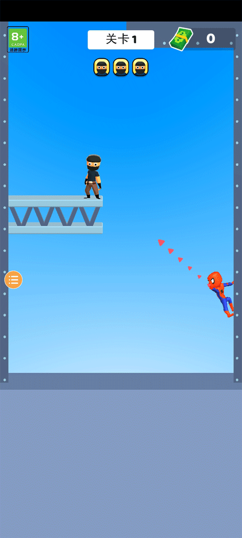 绳索蜘蛛侠是一款休闲益智类手机游戏,采用精美的画面和可爱卡通风格的蜘蛛侠形象,第一人称视角让玩家能够轻松代入其中。游戏中,城市中出现了大量怪物,它们肆意破坏,而玩家则扮演城市的守护者,通过消灭敌人来保卫和平。游戏玩法简单易上手:玩家需要先拖曳瞄准蛛丝的落脚点,然后释放射击将其粘贴在目标位置,移动至相应位置后即可攻击敌人并解锁更多关卡地图。快速通关的关键在于根据不同关卡设置的陷阱和攻击物调整瞄准策略,迅速击倒敌人。【游戏优势】1. 玩家可利用蛛丝将目标吸引到一起,展开全新挑战。2. 通过让敌人相互碰撞或撞击物体开辟新路,结合地形玩出多种花样。3. 趣味十足的题材搭配第一人称视角操作,带来沉浸式闯关体验。4. 流畅的操作手感和精美的画面效果提升整体游戏品质。【新手玩法指南】1. 基本规则:拖曳瞄准 → 释放射击 → 点击移动2. 操作技巧: - 出现红色虚线时表示处于瞄准状态,对准敌人后点击即可击倒。 - 根据关卡目标完成任务,击倒所有敌人后通关成功。 - 成功通关可获得奖励。3. 基本关卡示例: - 遇到扔炸弹的绑匪时,需迅速远离爆炸区域并将其击倒。 - 在面对阻碍箱和定时炸弹的关卡中,建议采用快速精准的打法。【游戏特色】1. 独特的绳索技巧让玩家体验飞跃高楼与自由飞行的乐趣。2. 展现超级英雄敏捷动作,迅速制服各类罪犯。3. 使用多种武器摧毁顽固敌人,面对危险果断出手。4. 感受畅快的物理动作效果和精美的3D游戏场景。5. 解锁丰富的奖励内容,包括各种武器和跑车。【游戏亮点】- 以蜘蛛侠的身份成为强力冒险家,在重重关卡中挑战自我。- 在虚拟世界中击败敌人,操控蜘蛛侠展开刺激闯关。- 守护城市安宁,肩负超级英雄的责任与使命。绳索蜘蛛侠凭借其独特的玩法和精美的画面,为玩家带来充满乐趣的冒险体验。快来下载游戏,化身蜘蛛侠,保护这座城市吧!