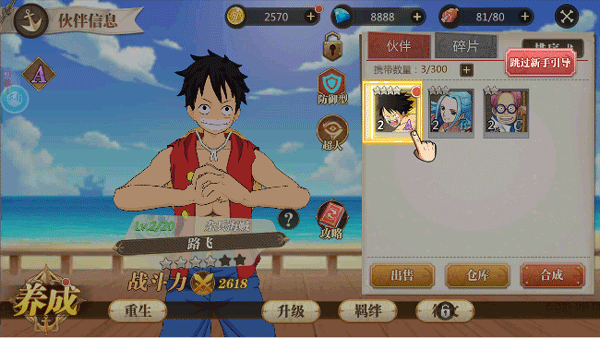 3、点击伙伴之后再进行养成的界面,使用战斗后获得的手册可以用来激活,激活之后可以将角色进阶为实习海盗,提升角色的等级!