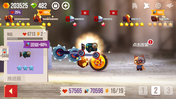 作为一款新派的战车对抗游戏,喵星大作战在玩法上采用自动配对对战的模式,在这里玩家只需点击“快速战斗”进入竞技场,通过自动匹配的形式即可进行车轮自动战斗。游戏里打败对手的方式有两种,一种靠武力,另一种靠智力,其中靠强力武器直接把对方血条直接打到归零,而靠智力则是将对手掀翻、并将其压在墙角等待场景中的电锯将其碾成粉末,另外还有利用战车形状的优势搭配喷射器直接翻越敌人在其背后慢慢输出。总之精彩不止,意外连连,快来体验一下吧!