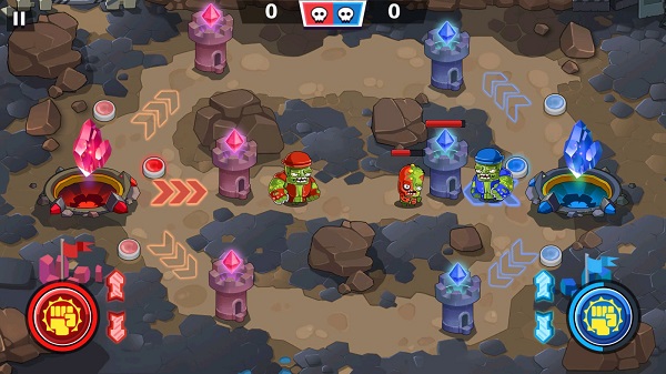 除了僵尸特工,关于另外两种模式基本都是对抗挑战,水晶塔防将展示个人的头脑策略,可选择的三条进攻路径极大的提高了战术的趣味性,而且操作上同样仅需一指便可操作,只不过出兵的方式有点奇特,玩家需要合理控制按压的力度来完成出兵,其中控制在不同的区域可以实现出战的类型也不同。其次,就是枪战对决,这个模式需要玩家穿越迷宫,拾取地图上的枪支、道具来寻找对方,并消灭对方。
