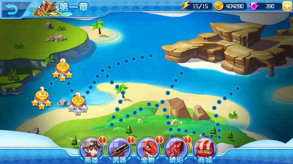 游戏中除了为玩家们提供不同的角色之外,还加入了几种不同的宠物,这些宠物都可以通过一定的花费来解锁,然后就会有一头小恐龙跟随我们一起战斗。除了宠物之外,对于射击游戏来说武器系统是尤为重要的,本作为玩家们提供了四种武器,分别是冲锋枪、榴弹枪、毒雾枪、散弹枪,每一种武器都有不同的攻击方式,当然也只有第一个武器是免费的,后面的武器虽然强大,不过都需要较多的钻石才能解锁,并不太适合普通玩家,好在我们的基础武器可以通过金币升级的方式来提升攻击力,这也算是普通玩家们比较实用的一种增强战力的方法吧。
