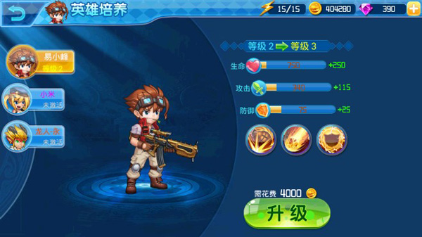 游戏为玩家们提供了三个角色,分别是易小峰、小米、龙人,三个角色中龙人的属性最强大,不过所需要花费的钻石也是最多的,一般而言我们的易小峰就足够了。多个角色的选择可以让玩家们体验不同人物的战斗方式,它们不同的攻击手段与技能招式,不过对于普通玩家来说,没有必要花钱去解锁另外的角色,我们可以通过金币强化的方式来提升主角的属性,这样也能大大增加角色实力,在战斗的时候也足以应付各种强大的BOSS了。