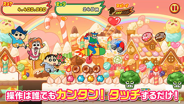 该作在玩法上采用了传统的酷跑方式进行,玩家将选择一名角色进行游玩,还提供了大量的经典角色供玩家挑选,如广志、美伢、小葵、动感超人、小白,以及春日部防卫队的成员等都在这里,而且每个角色都有属于自己独特的技能,玩家可以根据自己喜爱来选择。