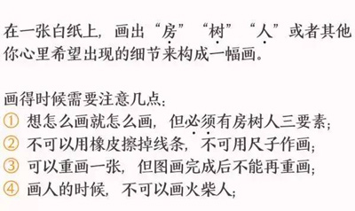 “房树人测验”是属于心理投射法测验,与其他心理测试最大的区别就是房树人测验”是非言语性的;