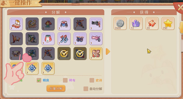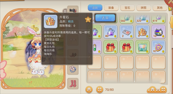 基本上要完成升星的操作,星星获取的话可以刷山岳洞穴2这张图,这张地图可以带来大量的星晶和史诗装备,与装备分解,只要达到史诗装备,就一定能分解出星晶和星币,有的时候打一些好掉落,但并不重要的史诗装备也是相当不错的选择,在这张地图中,打副本获得的可爱拳套以及法杖,这些装备效果并不强,但容易获取,玩家们可以放心分解。