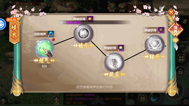 1、运行游戏后,在获得了第一只坐骑后玩家就可以通过任务提高自己的境界了,在这里选择并点击“当前境界”的区域选项;