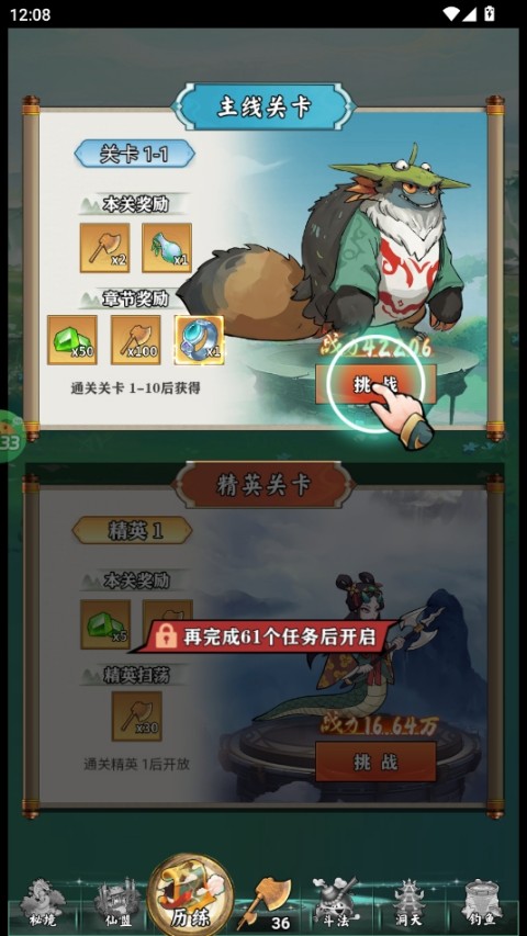 2、进入游戏后,点击下方斧头砍树获得装备,穿戴获得的装备提高战力