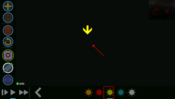 3、下面我们要创建一颗围绕着你的恒星运行的行星。选择气体行星铅笔。现在,拖拽你的手指穿过工作区域,画出一道靠近恒星的航线。行星将在这条航线的起始点上被创建,它的初始周转速度将由这条航线的方向决定。