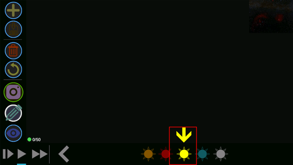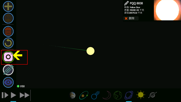 1、打开行星起源2汉化版,首先是了解各个功能的作用,在创建一个太阳系之前,先要创建一个全新的黄色星星。
